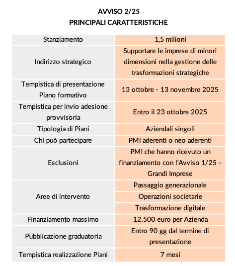 L’Avviso è rivolto esclusivamente alle PMI aderenti e neo-aderenti al Fondo, con l’eccezione di quelle che hanno già beneficiato di un finanziamento tramite l’Avviso 1/2025. Ogni azienda potrà presentare un solo Piano formativo, in forma singola, richiedendo un finanziamento massimo di 12.500 euro.